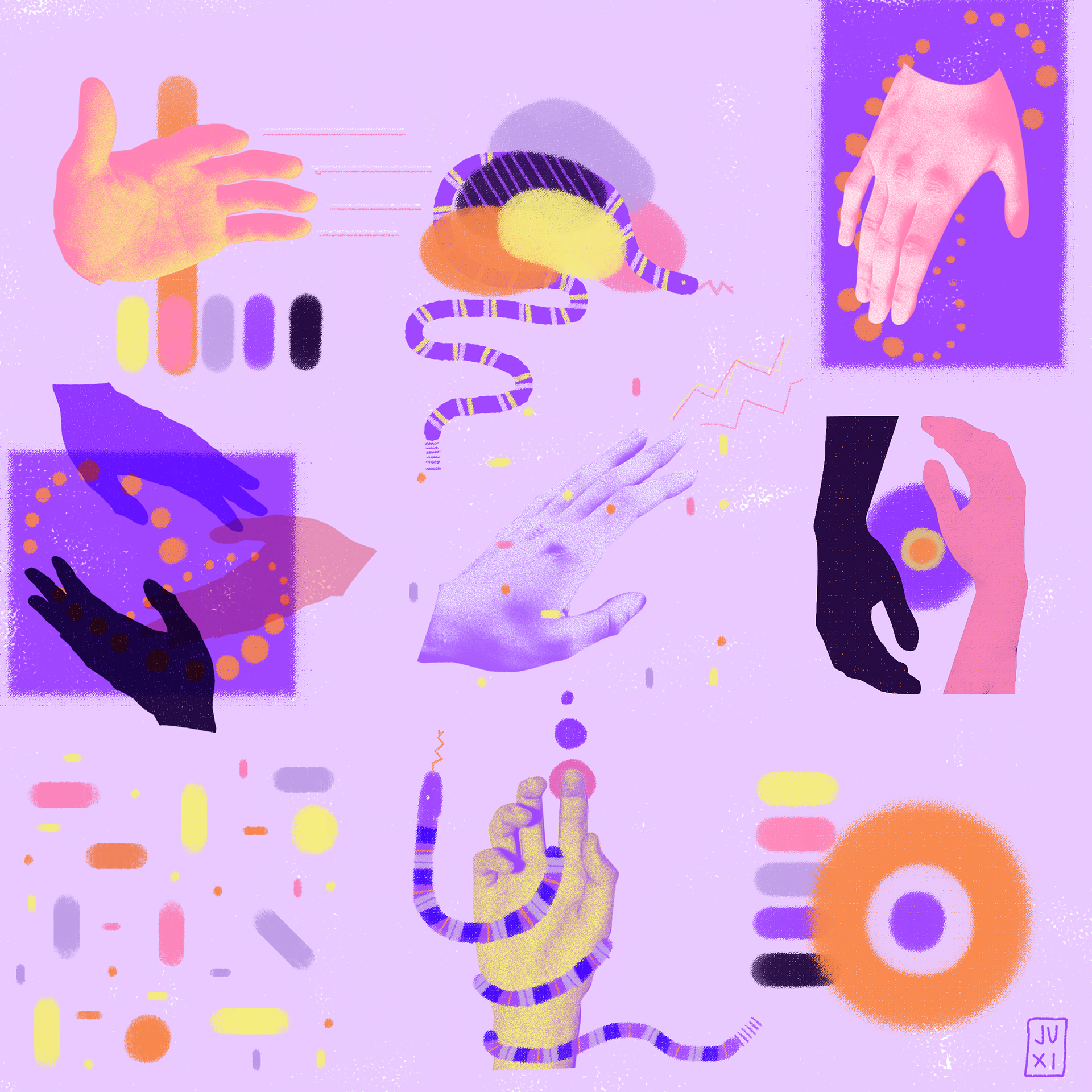Blend of digital and analog techniques, exploring textures, color, layers, and forms. * * * Combinación de técnicas digitales y analógicas, exploración de texturas, color, layering, figuras y formas.
